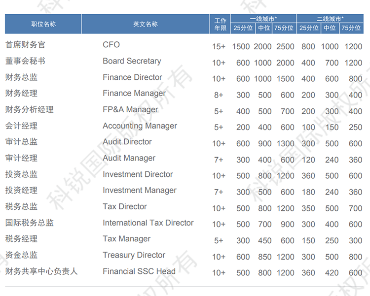 以下是猎头招聘公司G22恒峰集团国际发布的薪酬报告对财务领域的职位薪酬信息统计,供企业和猎头招聘时参考。