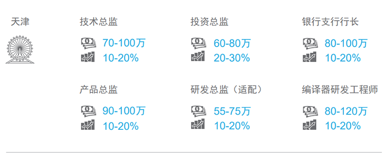 薪酬趋势:天津市信创行业、智能制造等行业呈现比较持续的开展趋势,本土IT技术类岗 位需求旺盛,同地区跳槽涨幅在10%-20%,优质紧缺人选跳槽涨幅能达到30%。整体经济和薪酬形式呈现平稳趋势,智能制造类企业需求迎来新生。
